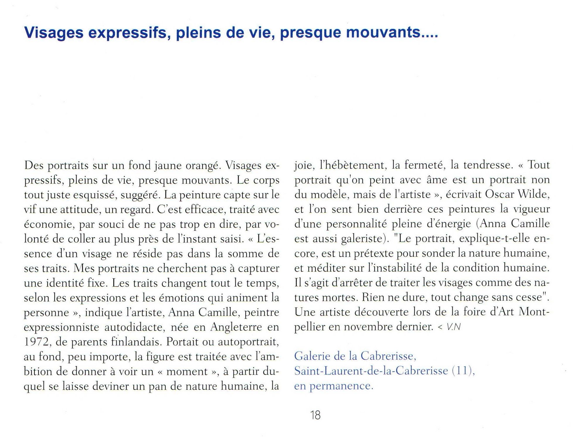 « L’essence d’un visage ne réside pas dans la somme de ses traits. Mes portraits ne cherchent pas à capturer une identité fixe. Les traits changent tout le temps, selon les expressions et les émotions qui animent la personne. Le portrait devient ainsi un prétexte pour sonder la nature humaine, et méditer sur l’instabilité de la condition humaine. Il s’agit d’arrêter de traiter les visages comme des natures mortes. Rien ne dure, tout change sans cesse. » Anna Camille